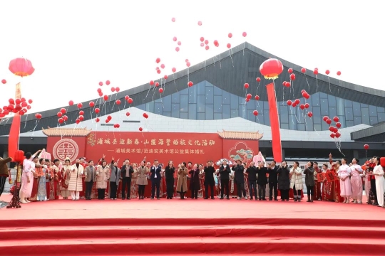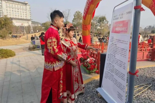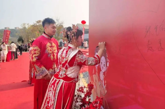 伴隨著歡樂、喜慶的鑼鼓聲,15對新人身著華麗的中式禮服,在“福娘”的引領下,過火盆、跨馬鞍、掀蓋頭,在親朋好友及在場人員的共同見證和祝福下,宣讀誓詞,許下愛的承諾。