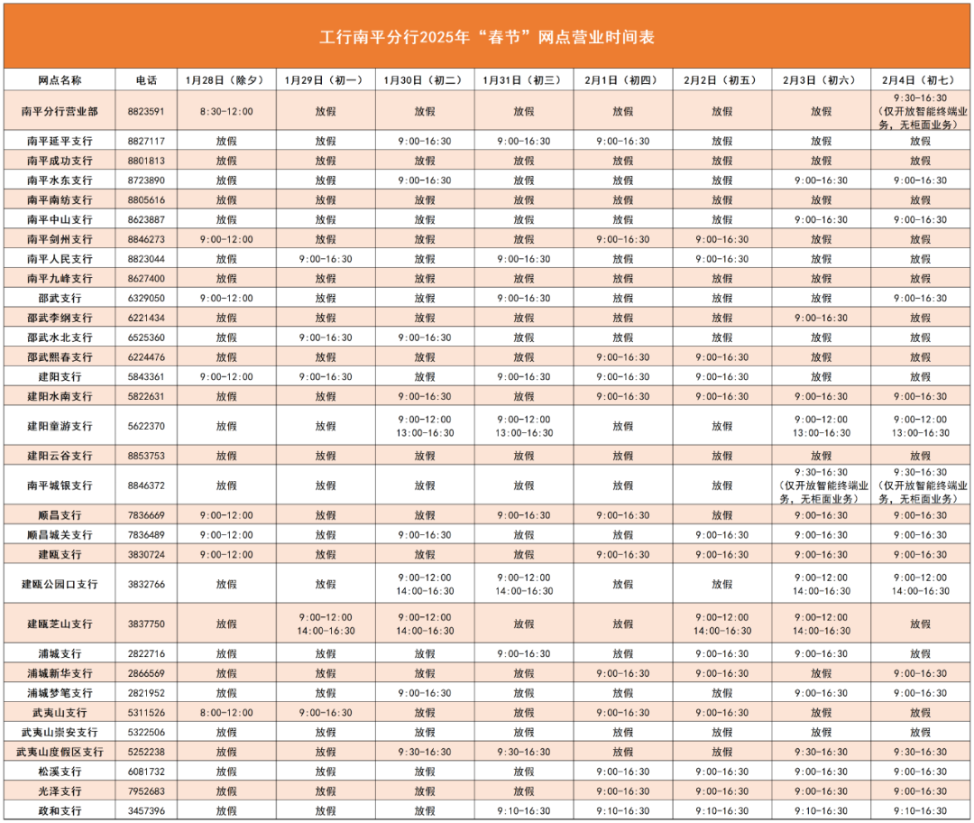 營(yíng)業(yè)公告丨工行南平分行2025年春節(jié)假期網(wǎng)點(diǎn)營(yíng)業(yè)時(shí)間表