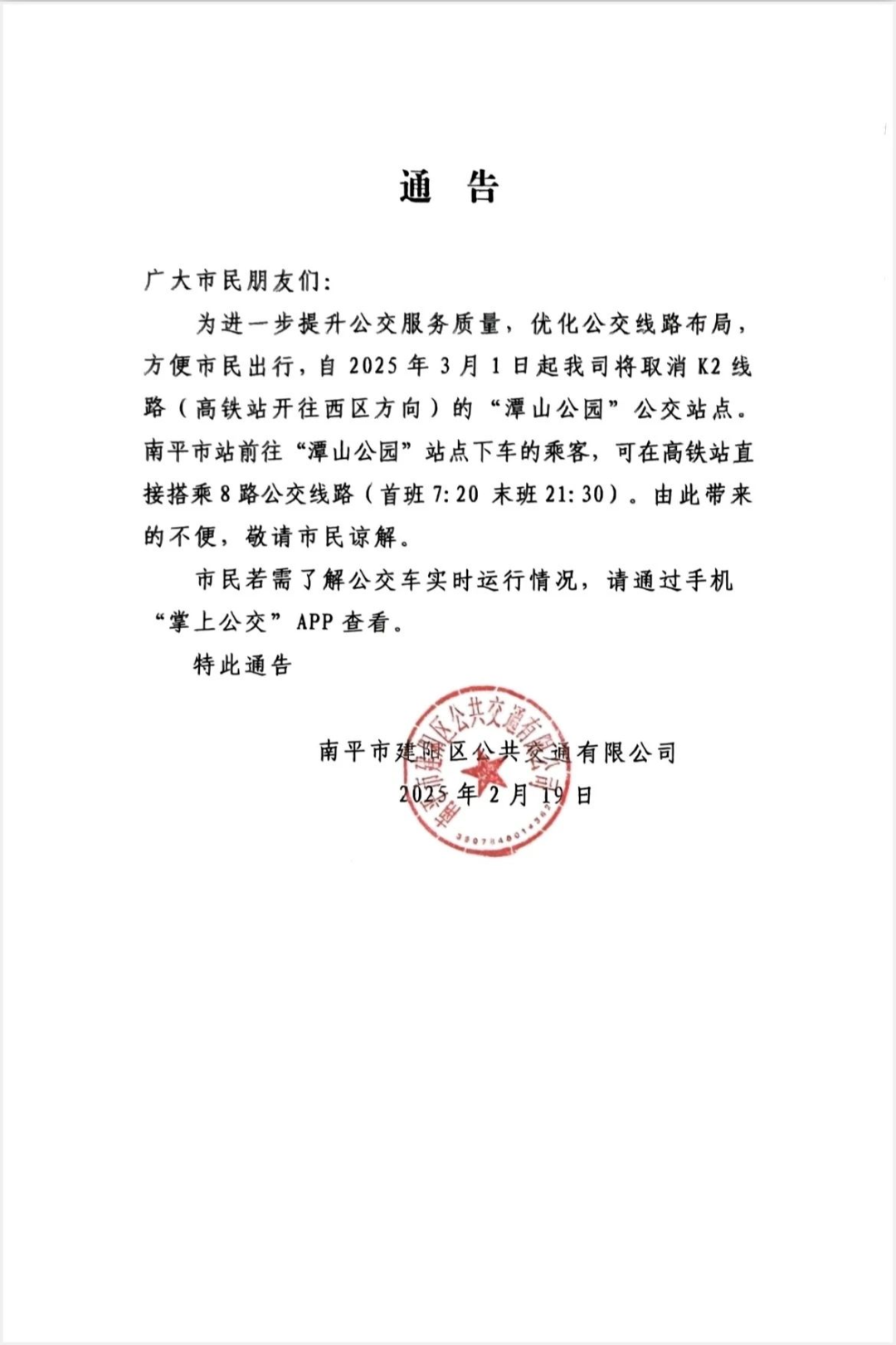 國企動態(tài)|建陽公交關(guān)于取消K2路“潭山公園”公交站點的通告