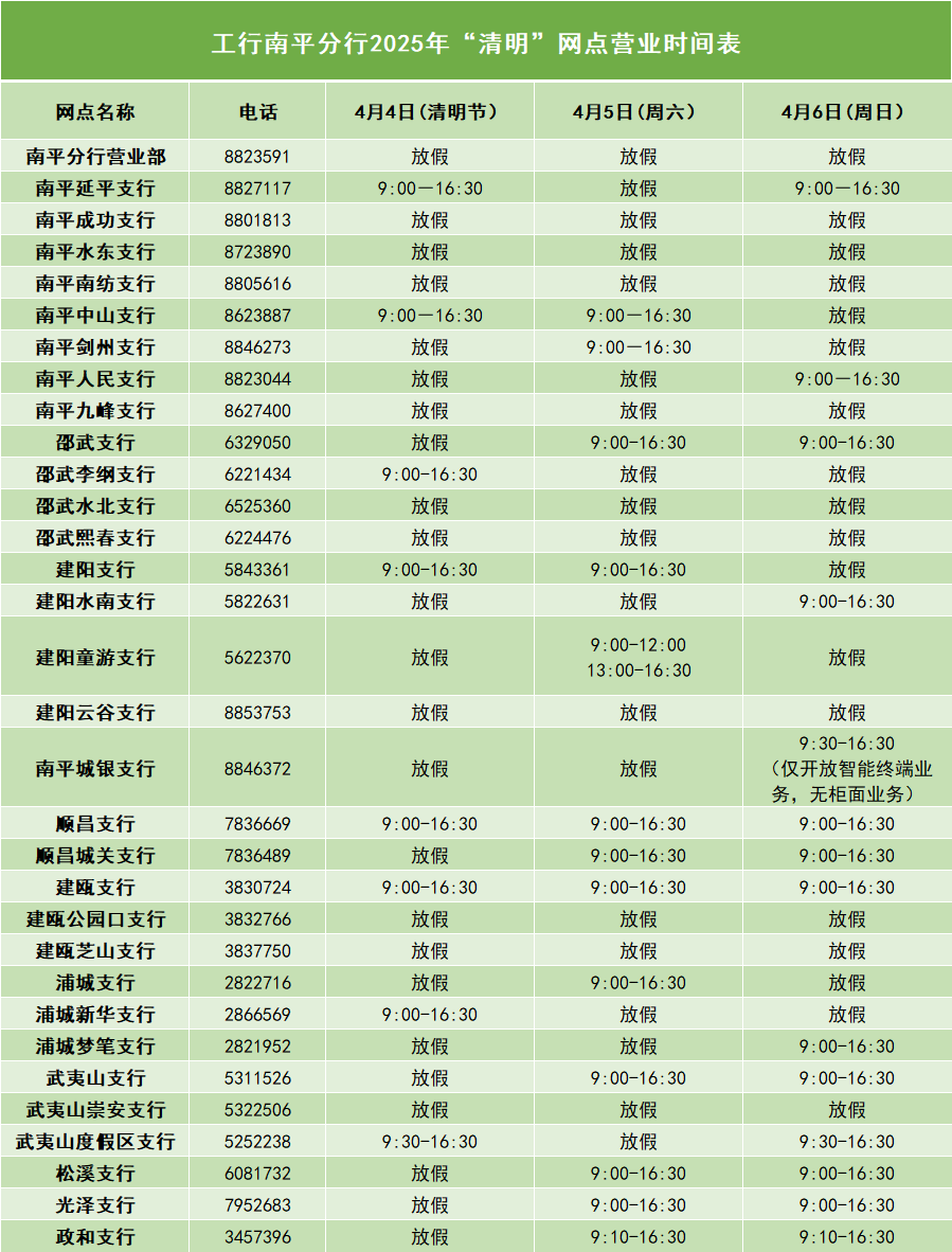 營業(yè)公告丨工行南平分行2025年清明假期網(wǎng)點(diǎn)營業(yè)時間表