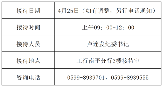 中國工商銀行南平分行2025年4月“行長接待日”公告