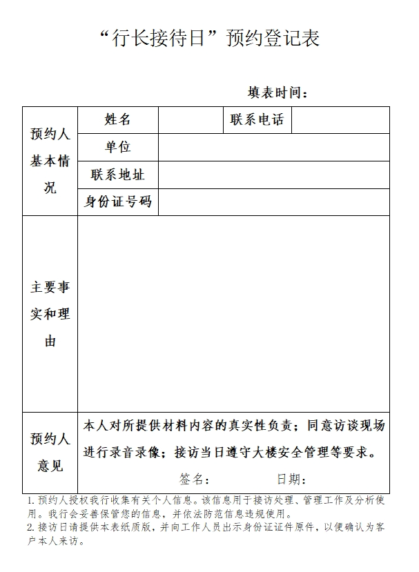 1.預約時您需提供準確的相關信息,填寫《“行長接待日”預約登記表》,說明所反映的情況和相關事由,同時可以提交相關證明材料。