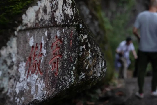 一路往上,未登天游之險(xiǎn),卻臨“寄傲”處。范老師從落款處解讀,認(rèn)為此方摩崖石刻應(yīng)為“傲寄”,許老師則認(rèn)為登臨此處要把傲氣放下,可我卻更傾向于將傲氣寄托于此之意。人生愁苦,在世間已有太多的委曲求全,登高望遠(yuǎn),天高云闊,難道還不能傲上一回?在此處應(yīng)擺開最忘我的姿態(tài),臨風(fēng)長嘯,傲然于世。待緩步往下,走入塵世,煩愁于日?,嵤轮畷r(shí),起碼在心中還有一方可守,一處可去。