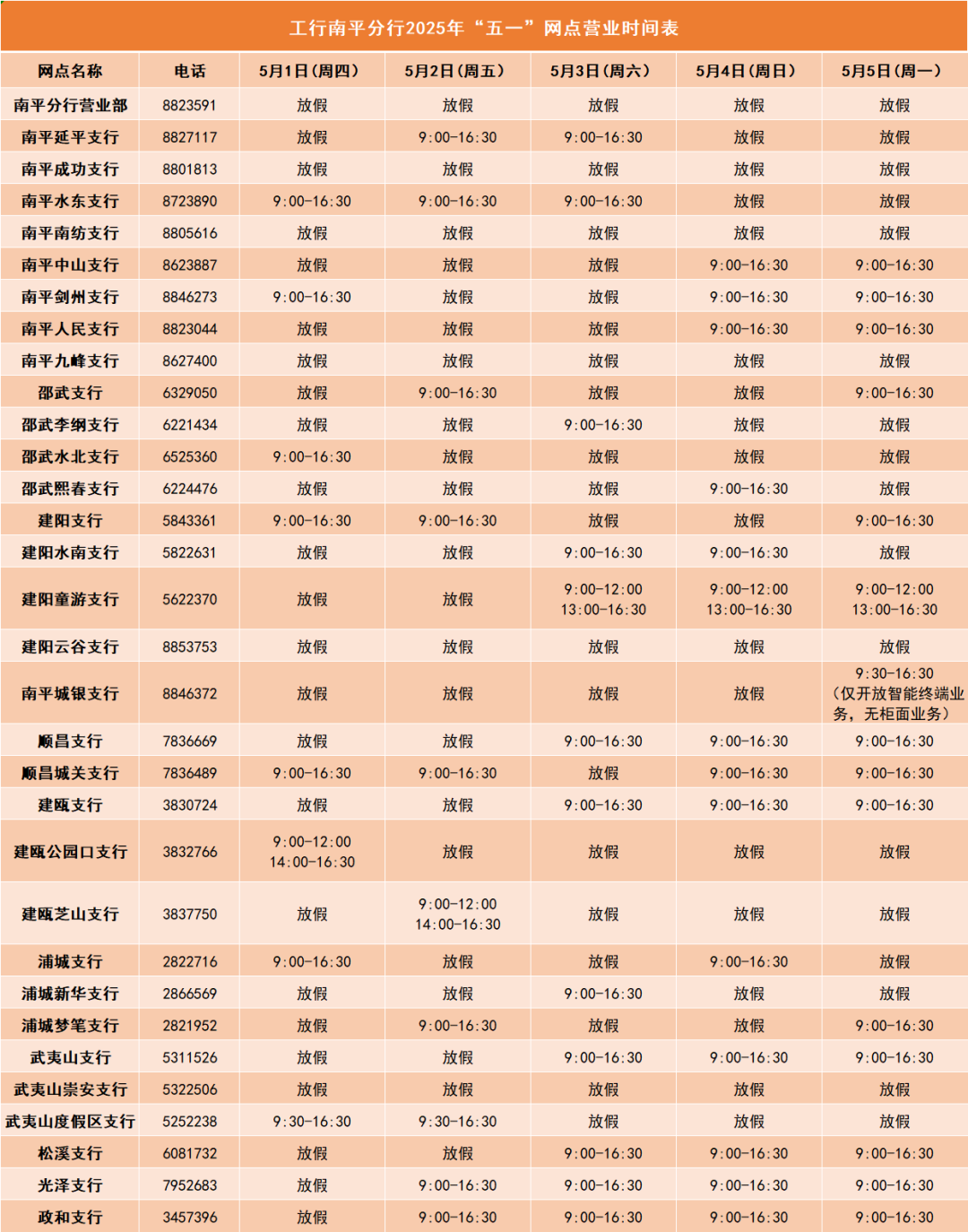 營業(yè)公告丨工行南平分行五一假期網(wǎng)點(diǎn)營業(yè)時(shí)間表