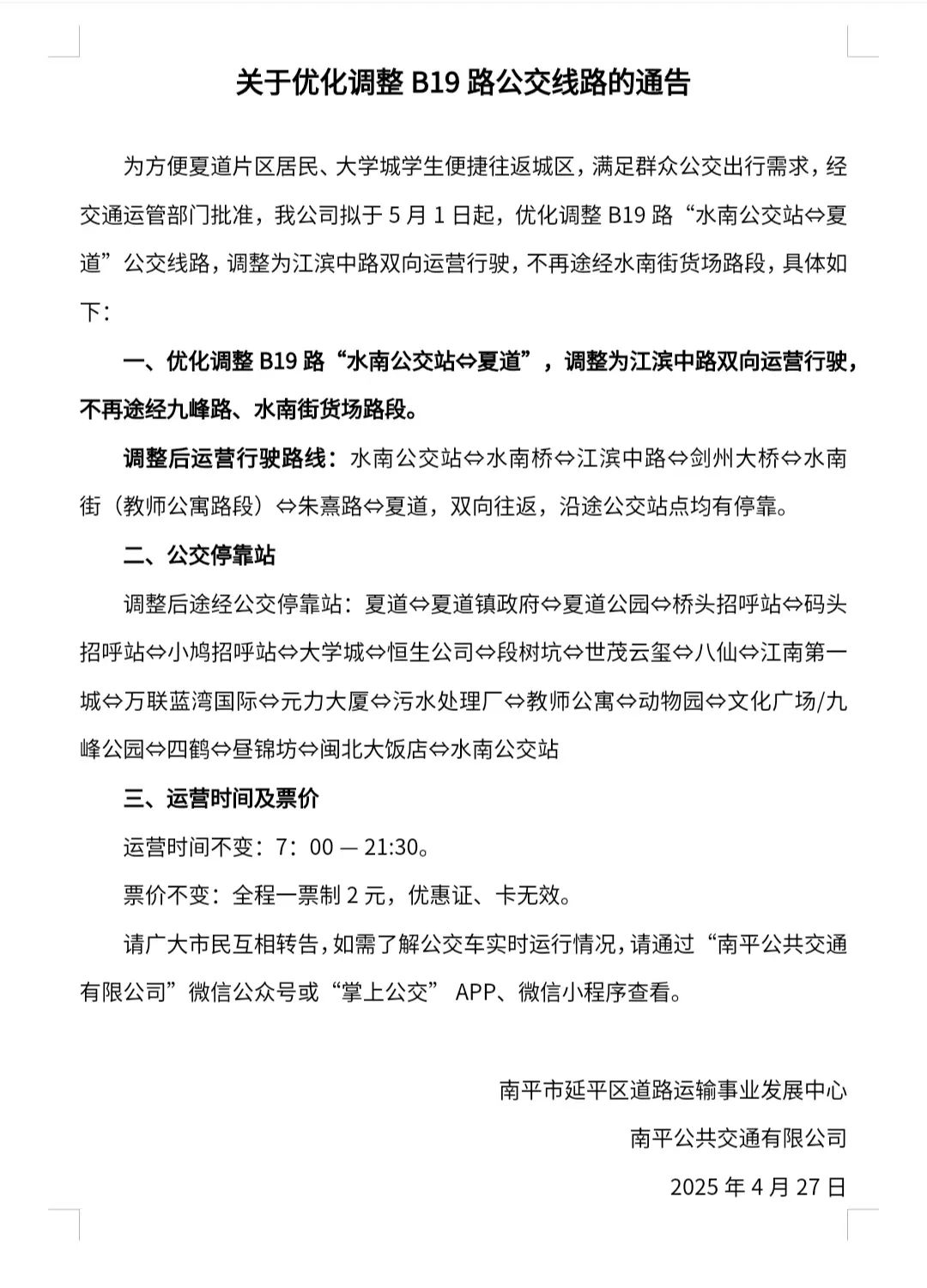 公示通告|關(guān)于南平公交優(yōu)化調(diào)整B19路公交線路的通告