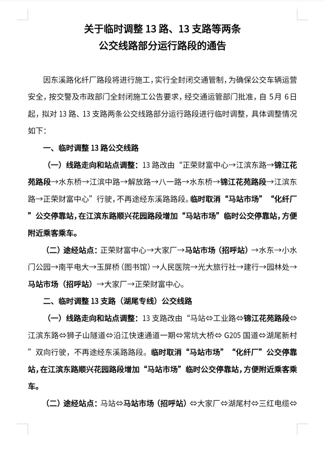公示通告|關(guān)于南平公交臨時(shí)調(diào)整13路、13支路等兩條公交線路部分運(yùn)行路段的通告