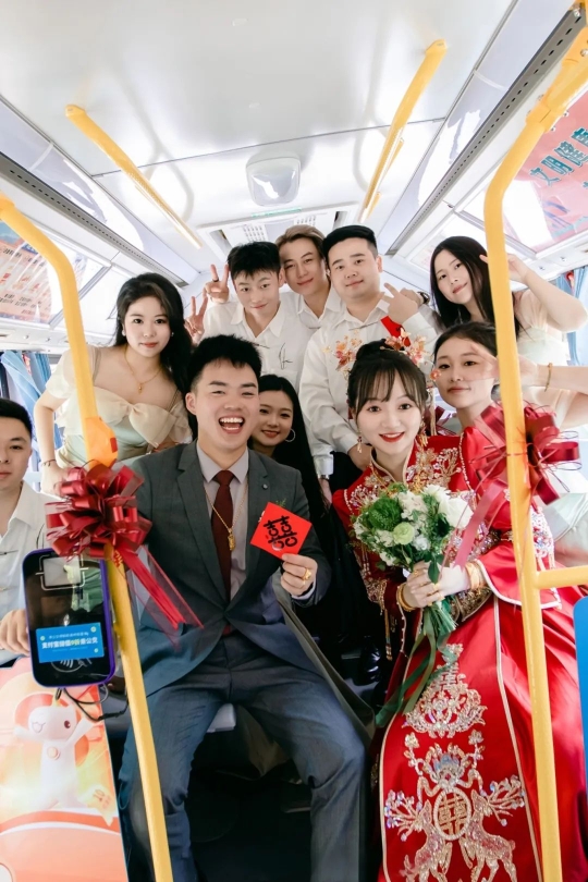 “這次,我們不用豪華車隊迎親,只租了1輛公交車當婚車,不僅環(huán)保經(jīng)濟,還給親友留下了特別的印象。我們夫妻倆都對這次‘公交婚車’非常滿意?!毙履镏苄〗阏f道。