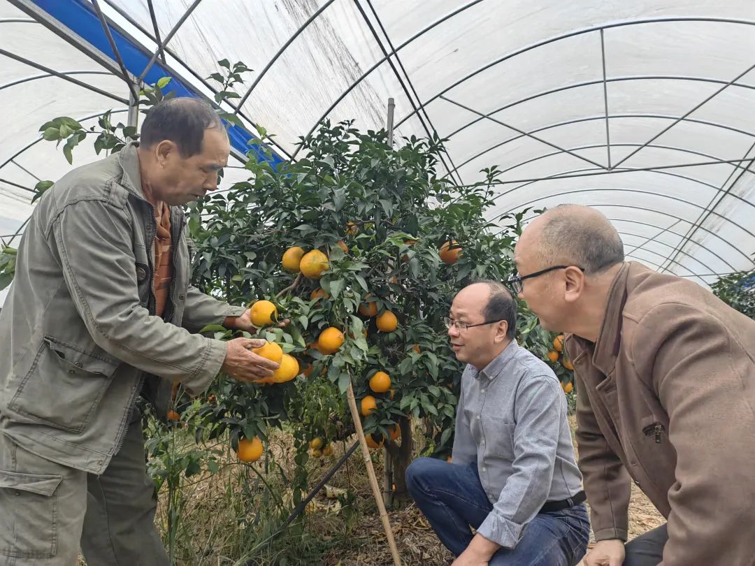 2023年11月7日,肖森官向科特派團長高允旺(右一)、雙溪街道科特辦負責人侯良春講解柑橘優(yōu)質果栽培技術。