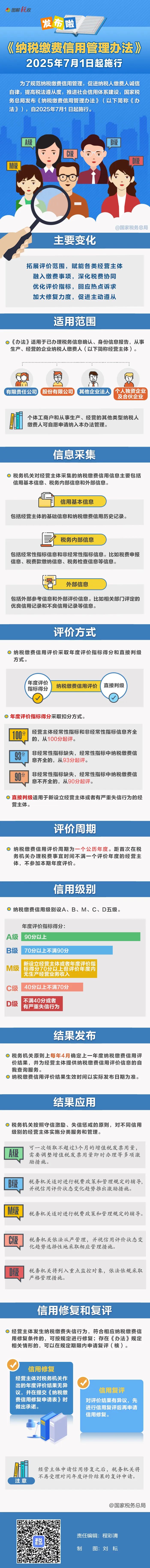 為了規(guī)范納稅繳費(fèi)信用管理,促進(jìn)納稅人繳費(fèi)人誠信自律,提高稅法遵從度,推進(jìn)社會(huì)信用體系建設(shè),國家稅務(wù)總局發(fā)布《納稅繳費(fèi)信用管理辦法》,自2025年7月1日起施行。政策要點(diǎn)有哪些,一圖了解↓