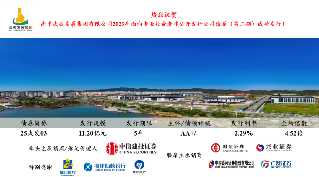 6月24日,南平武夷發(fā)展集團在上交所成功簿記發(fā)行2025年度第二期面向?qū)I(yè)投資者非公開發(fā)行公司債券,發(fā)行規(guī)模11.2億元,期限5年,票面利率2.29%/年,全場認購倍數(shù)高達4.52倍,認購資金總量達50.62億元。本次債券由中信建投證券擔任牽頭主承銷商,財達證券、興業(yè)證券、銀河證券、廣發(fā)證券擔任聯(lián)席主承銷商。此次發(fā)行,提高了集團在資本市場的認可度,保障了集團權(quán)屬企業(yè)存量同類債券產(chǎn)品本金的接續(xù),降低了集團的融資成本。