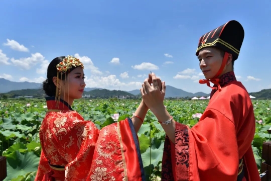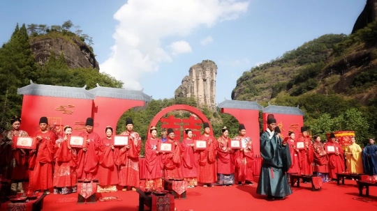 舉辦集體婚禮華實相宜。武夷山作為朱子理學的發(fā)源地,擁有得天獨厚的文化優(yōu)勢。2017年,首屆武夷山朱子婚禮大典在五夫鎮(zhèn)盛大開幕,33對來自海峽兩岸參加婚禮大典的新人身著漢服,以荷為媒,齊誦朱子家訓。目前,已舉辦“山盟海誓·夷見鐘情”“山盟海誓·愛在武夷”等主題集體結(jié)婚頒證儀式,新人們身著傳統(tǒng)服飾,在眾人見證下宣讀、簽署《結(jié)婚誓言》。集體婚禮隆重莊嚴、華而不俗、喜而不鬧,不僅具有傳統(tǒng)婚禮所賦予的儀式感,讓新人們深刻感受到婚姻的神圣與責任,同時也充分體現(xiàn)了婚事儉辦的婚俗文明。