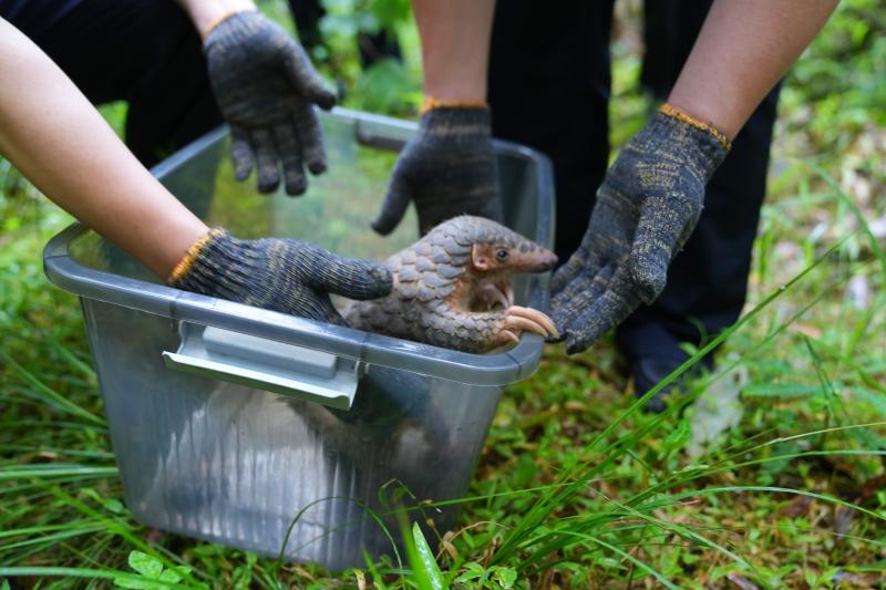 接到消息后,建陽區(qū)莒口森林公安、麻沙鎮(zhèn)政府、林業(yè)站相關(guān)工作人員迅速到達(dá)現(xiàn)場察看。經(jīng)工作人員確認(rèn),這是一只成年中華穿山甲,重約4.2斤,體長約60厘米,無外傷,健康狀態(tài)良好,符合野外放生條件。大家推測,“杜潭匯客廳”周邊植被繁茂、水源潔凈豐沛,是螞蟻、白蟻等昆蟲的活躍區(qū)域,這只穿山甲可能是在覓食時(shí)誤入了營地。當(dāng)天下午,工作人員在武夷山國家公園選擇了一處適宜的棲息地,將這只中華穿山甲放歸野外。