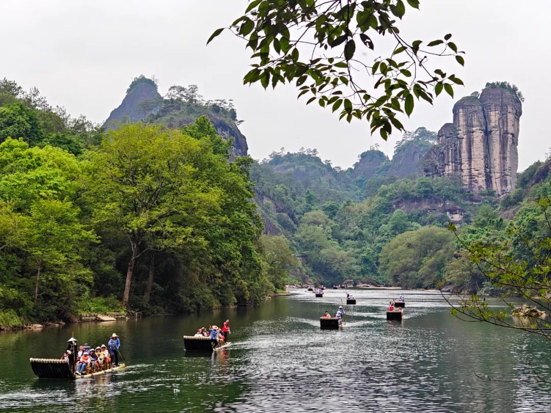 游人在武夷山國(guó)家公園九曲溪乘坐竹筏,欣賞兩岸風(fēng)光。(朱宇 林李冰 攝)