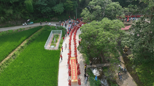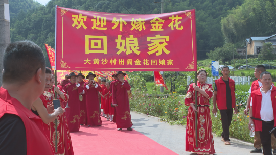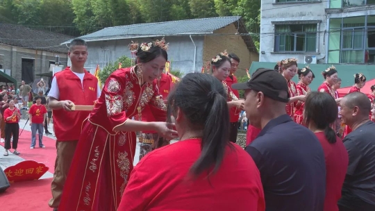 活動現(xiàn)場人頭攢動,身著秀禾服、旗袍等服飾的“娘子軍”款款走來,她們手持“山是家鄉(xiāng)美,水是故鄉(xiāng)甜”“感恩娘家,共思鄉(xiāng)情”等字樣的標牌,字里行間滿是對故土的眷戀。嗩吶聲中,村民們紛紛為回門的“女兒們”送上真摯祝福,一張張笑臉綻放著淳樸的喜悅。