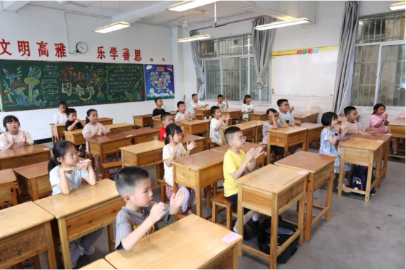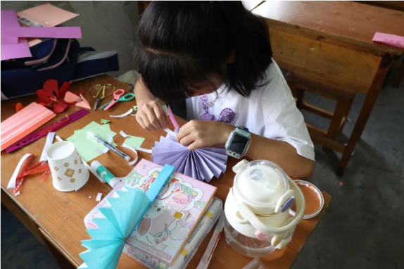 走進暑托班,到處洋溢著輕松歡快的氛圍,不時傳來孩子們歡樂的笑聲。音樂課上,老師正帶領孩子們學唱童謠《蝸牛與黃鸝鳥》。孩子們坐得筆直,小眼睛緊緊盯著老師,跟著節(jié)奏揮動小手。手工課上則是另一番熱鬧景象。桌面上擺滿了彩紙、膠水和剪刀,老師在孩子們中間穿梭,不時俯身指導,孩子們在老師的指導下一件件充滿童趣的作品在小手中逐漸成形。