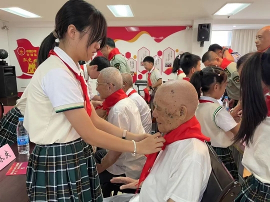活動(dòng)在溫馨而莊重的氛圍中拉開序幕,少先隊(duì)員代表上臺(tái)為在場(chǎng)的來(lái)賓敬獻(xiàn)紅領(lǐng)巾、向參戰(zhàn)老兵敬獻(xiàn)鮮花。