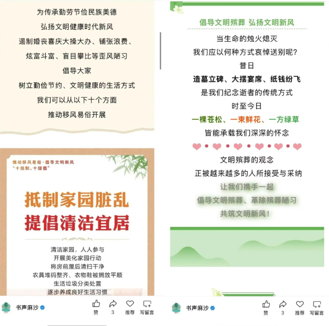 充分利用各村(居)“村村通”系統(tǒng),在早中晚重點(diǎn)時(shí)段循環(huán)播放《深化殯葬改革倡樹文明新風(fēng)倡議書》和移風(fēng)易俗宣傳音頻。同時(shí),積極運(yùn)用鎮(zhèn)政府微信公眾號(hào)、各村(居)微信群等線上平臺(tái),推送政策圖解、公益廣告、微視頻、移風(fēng)易俗先進(jìn)典型事跡等,擴(kuò)大宣傳覆蓋面和影響力。