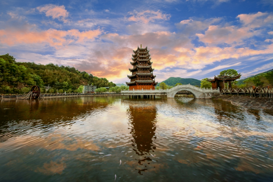 霞光映照下的順昌縣元坑古鎮(zhèn)文昌橋。(彭植連 攝)