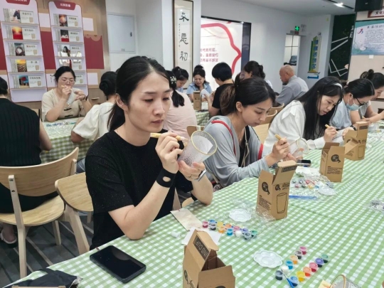 活動(dòng)現(xiàn)場(chǎng),工作人員早早擺好玻璃杯、圖紙與顏料,一步步示范勾線、暈染、封層的技巧。