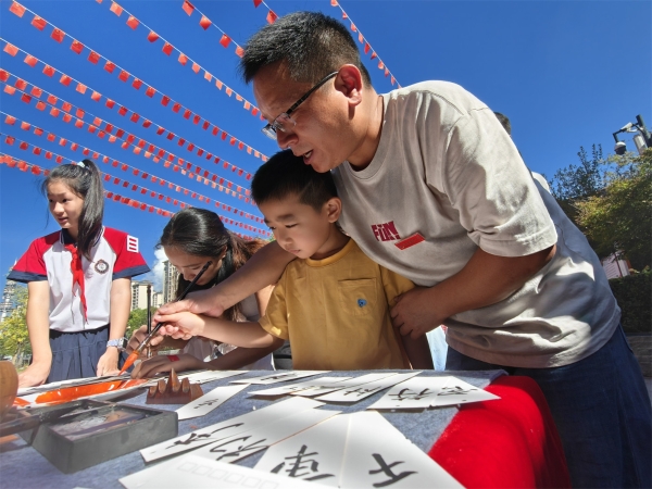 “握筆要穩(wěn),筆尖要輕輕落在紙上……”走進(jìn)校內(nèi)教學(xué)樓大廳,“小紅星開(kāi)筆禮”溫情不失儀式感。該校美術(shù)老師杜桂平端坐桌前,細(xì)致地為新生們示范:鋪展姓氏便簽、毛筆蘸飽墨汁,再手把手教孩子們書(shū)寫(xiě)自己姓氏的最后一筆。孩子們緊握毛筆,眼神專(zhuān)注而認(rèn)真,盡管筆下的字跡略顯稚嫩,卻飽含著對(duì)新學(xué)期的期待。寫(xiě)完后,他們舉起作品,向身旁的家長(zhǎng)展示自己的“開(kāi)學(xué)第一筆”,臉上滿是自豪。