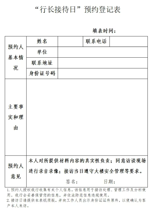 4.工作人員將在“行長接待日”前電話通知接訪日具體安排,請保持通訊暢通。