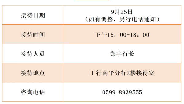 中國工商銀行南平分行2025年9月"行長接待日"公告