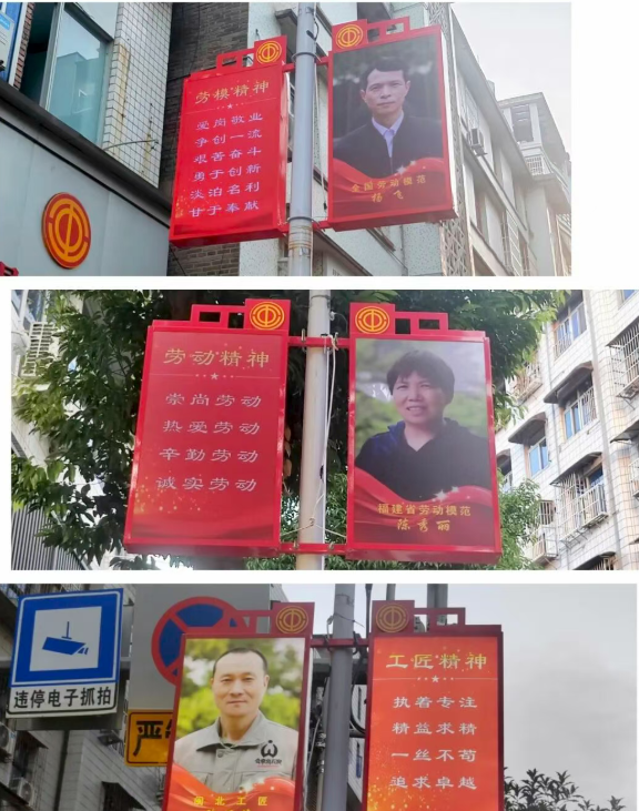 沿著城中路縣總工會(huì)至農(nóng)行路段漫步,道路兩側(cè)的燈桿上,46名各級(jí)勞模工匠的照片及宣傳牌有序懸掛。展示牌以鮮明的中國(guó)紅為主色調(diào),左側(cè)展示勞模工匠工作照,標(biāo)注姓名、榮譽(yù)稱(chēng)號(hào),右側(cè)鐫刻勞模精神、勞動(dòng)精神、工匠精神的核心內(nèi)容。46名勞模工匠涵蓋企業(yè)一線(xiàn)工人、鄉(xiāng)村振興帶頭人、教育醫(yī)療工作者等多個(gè)領(lǐng)域,從老一代勞模的開(kāi)拓奉獻(xiàn)到新時(shí)代工匠的創(chuàng)新突破,全方位勾勒出順昌勞動(dòng)者的奮斗圖譜。