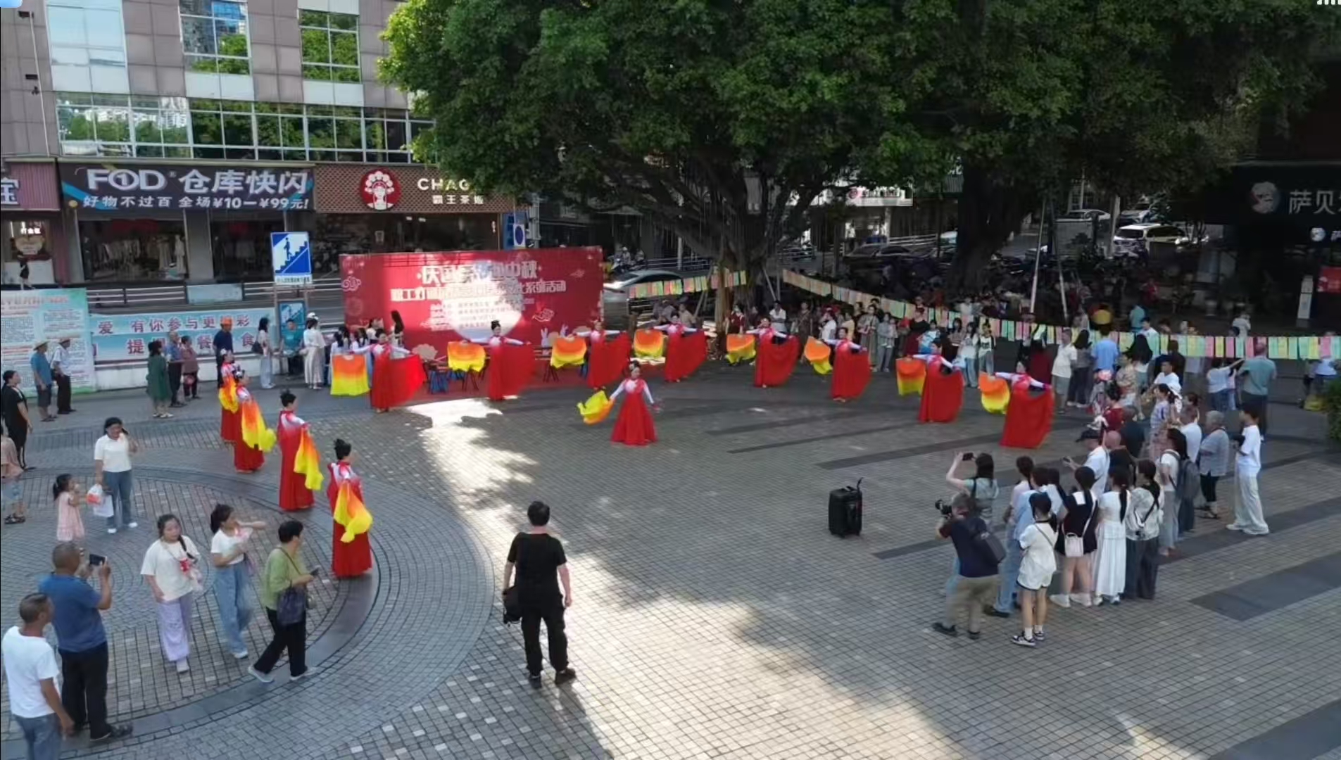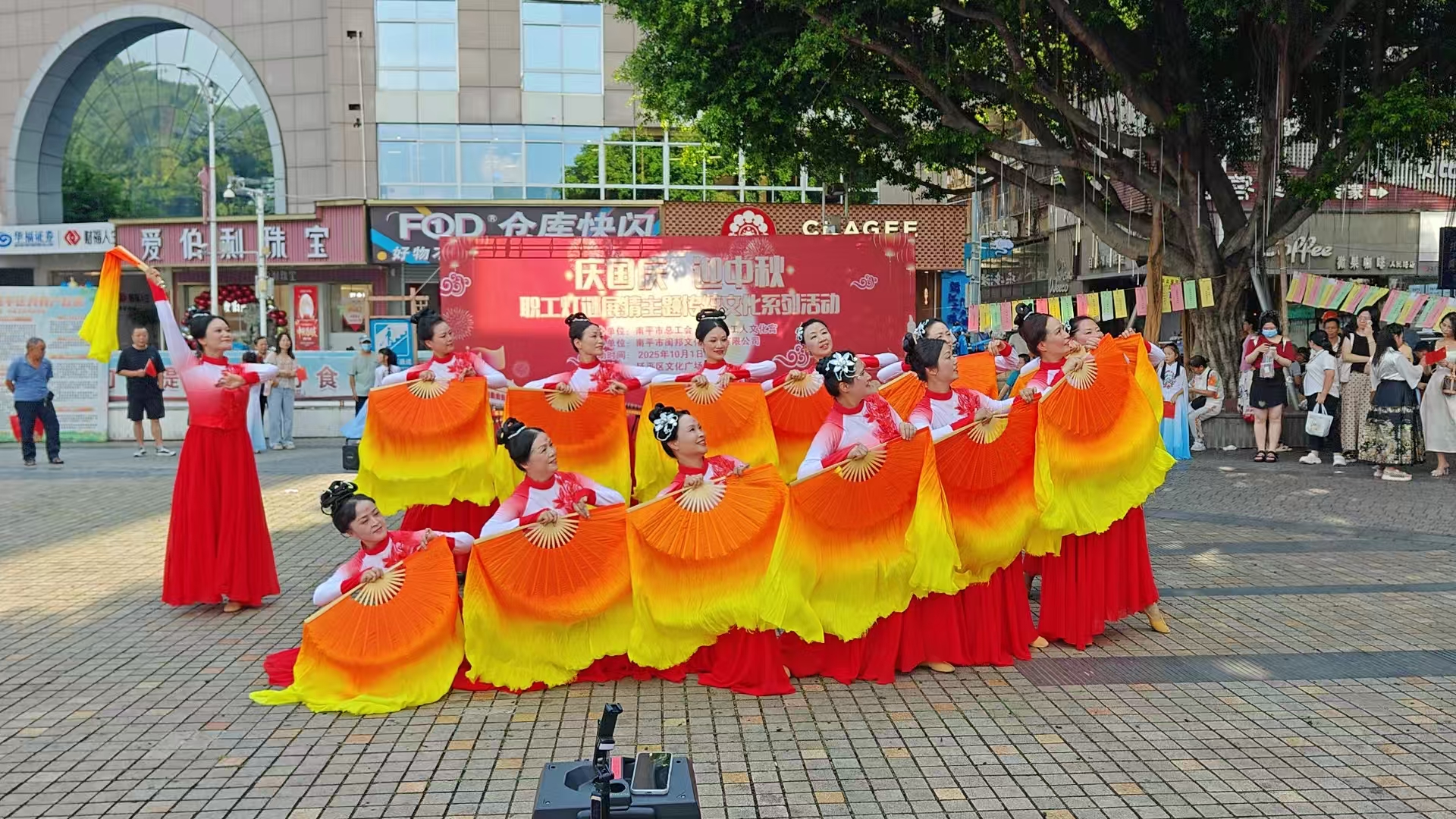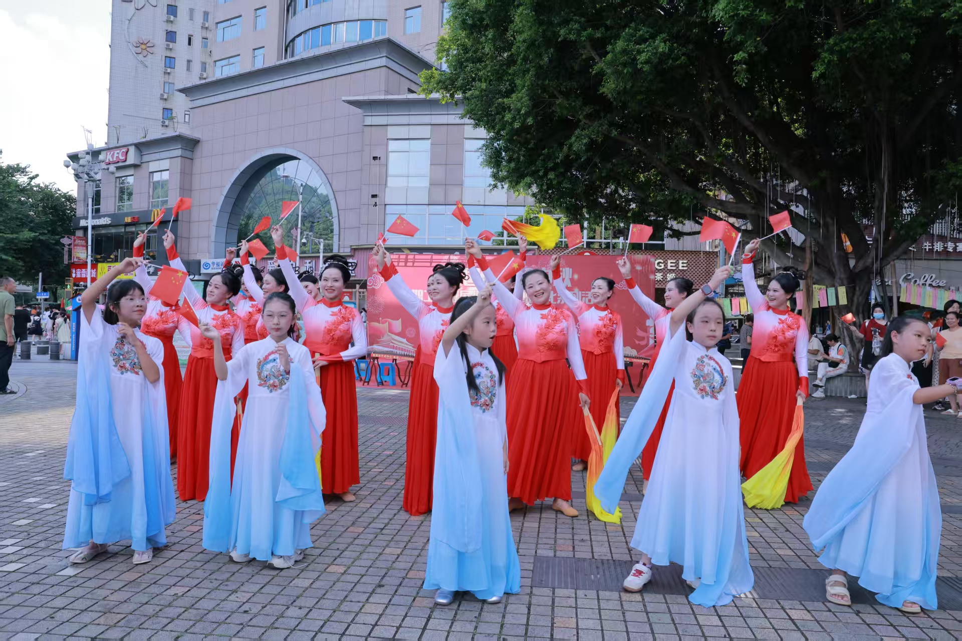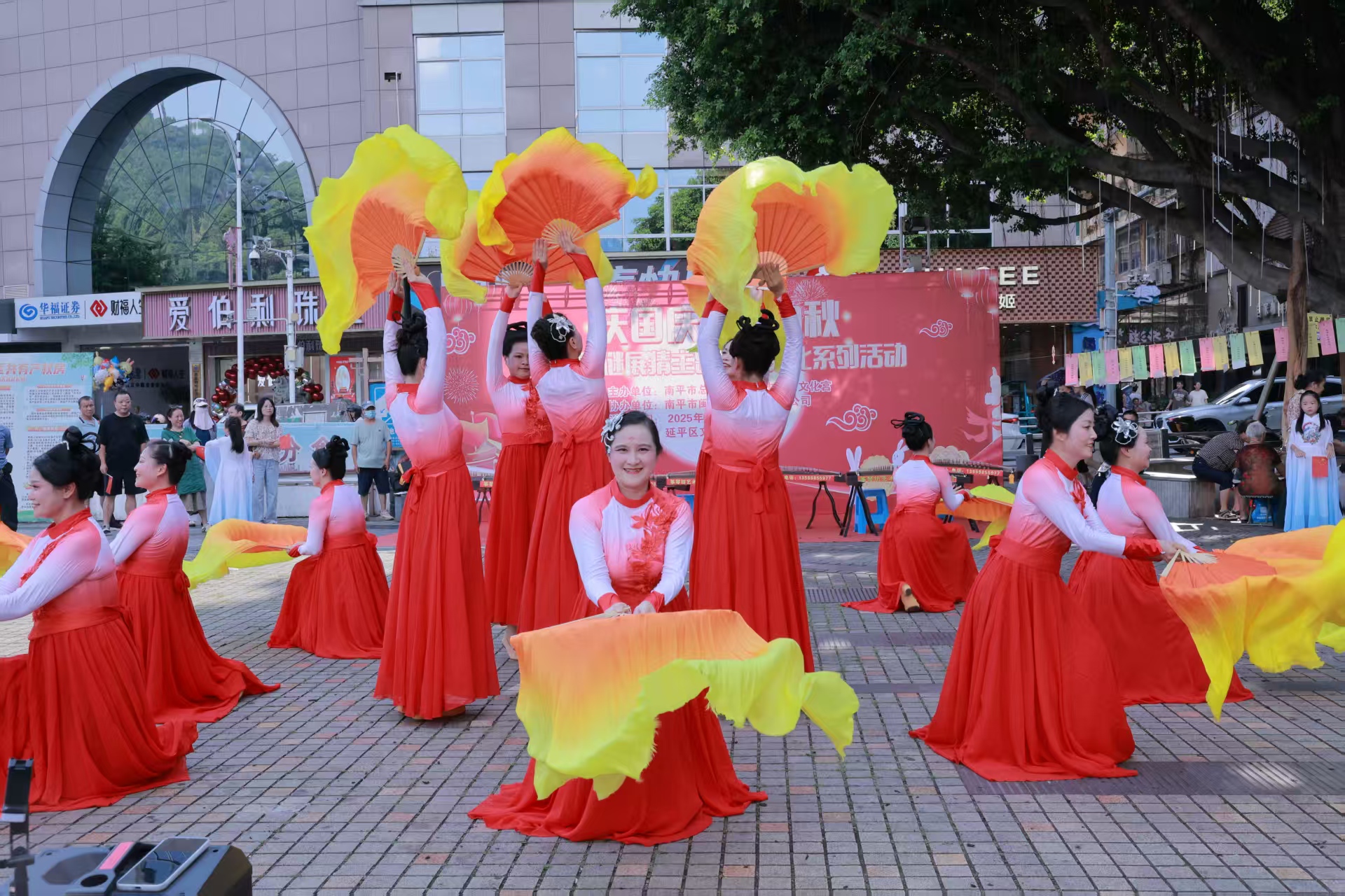 下午3時(shí),延平文化廣場(chǎng)人頭攢動(dòng),盛裝打扮的7位表演者從廣場(chǎng)四周走向廣場(chǎng)中央,一段盛唐古典舞《長(zhǎng)安春》拉開快閃表演的序幕,優(yōu)美的舞蹈吸引周圍群眾駐足觀看并向廣場(chǎng)中心靠攏,舞蹈結(jié)束后,緊接著,古箏小演員們開始用音樂表達(dá)自己對(duì)祖國(guó)的熱愛之情;隨后《我愛你中國(guó)》與大扇舞《我和我的祖國(guó)》輪番登場(chǎng),舞姿翩躚、扇影飛揚(yáng),現(xiàn)場(chǎng)洋溢著濃厚的節(jié)日氛圍與愛國(guó)情懷。表演在全場(chǎng)互動(dòng)《我的祖國(guó)》中落下帷幕,大家跟隨音樂一同歌唱,一起揮舞著手上的國(guó)旗,廣場(chǎng)上形成了一片歡樂的海洋。