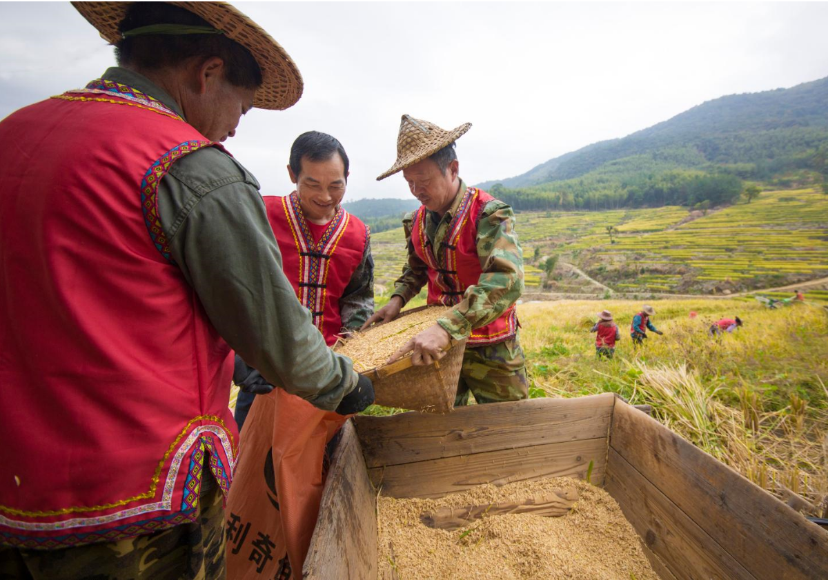 村民正在收割稻子。劉可升/攝