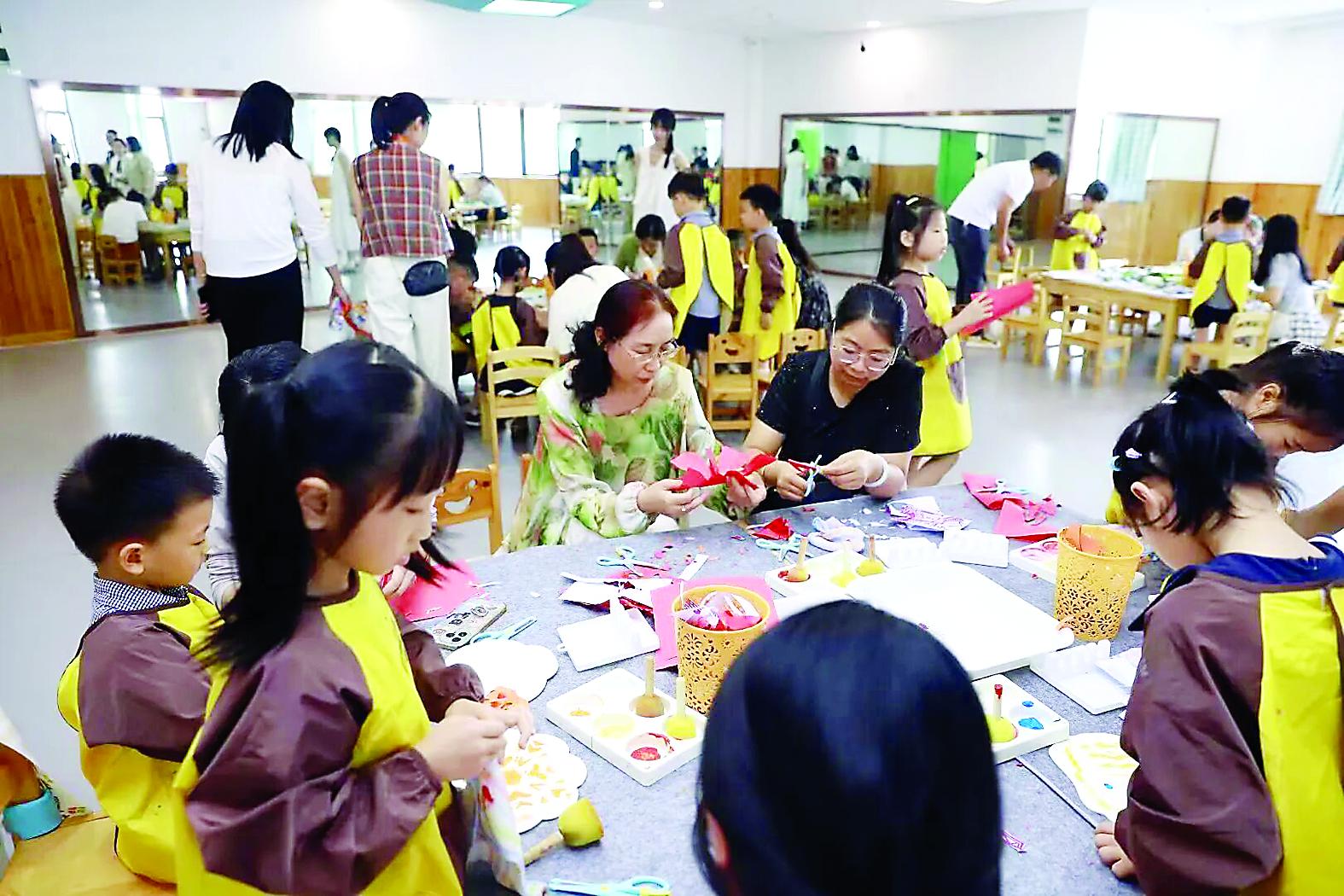 家長與孩子共同參與樹葉拓印、紙版套色等活動(dòng)