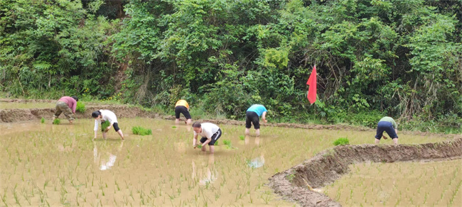 在認領的山隴田里,黨員干部們幾人排成一行,卷起起褲腳,彎下身子,插秧勞作,干得熱火朝天,共同將昔日荒廢的撂荒地打造成為生機勃勃的希望田。