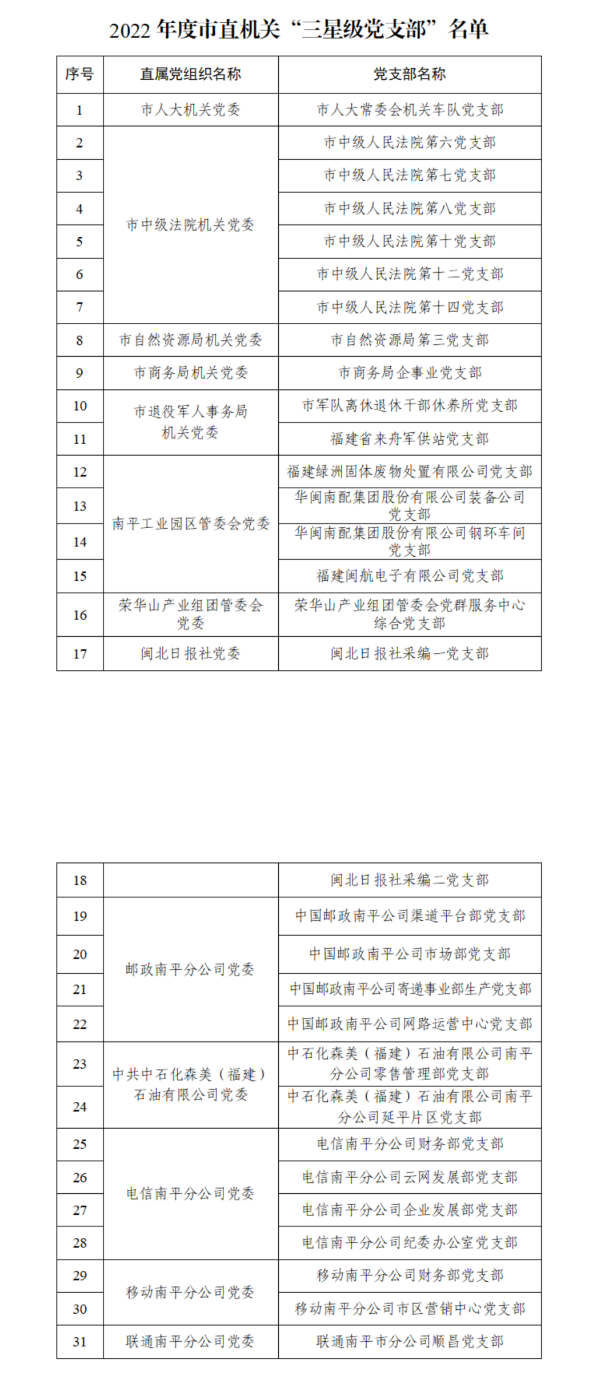 2022年度南平市直機(jī)關(guān)星級(jí)黨支部名單公布