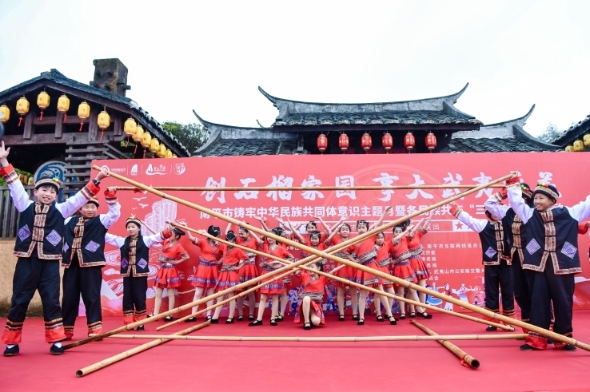 2025年“三月三——創(chuàng)石榴家園 享大武夷之美”活動,黎前村廣場的竹竿舞成了“網(wǎng)紅”打卡點。隨著《畬歌飛山河》的旋律,孩童們身著畬族服飾,在清脆的竹竿碰撞聲中歡快躍動,圍觀者笑聲與竹竿敲擊聲交織成趣?!爸窀团鲰懙氖枪?jié)奏,連起的是人心?!崩枨按妩h支部書記、村主任王發(fā)亮介紹,這場盛會不僅展示了非遺技藝,更通過“圍爐話團結”茶席,讓各族同胞在氤氳茶香中拉近距離,共繪“民族團結同心圓”的場景。移風易俗情景劇《心愿》,再現(xiàn)了紅白理事會勸導村民簡辦喪事的真實故事,“不擺流水席、不收人情禮”的愿望引發(fā)觀眾陣陣掌聲。