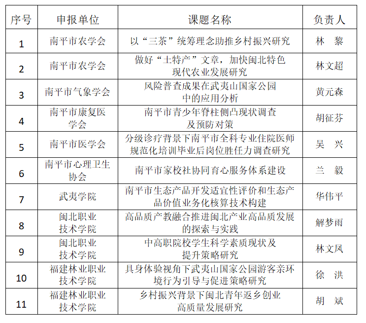 根據(jù)《關(guān)于組織開展2023年南平市科協(xié)科技智庫(決策咨詢類)課題調(diào)研的通知》(南科協(xié)〔2023〕14號)精神,市科協(xié)黨組對各市級學(xué)會(協(xié)會、研究會)、高校科協(xié)申報的課題進(jìn)行了研究,擬定2023年南平市科協(xié)科技智庫(決策咨詢類)課題調(diào)研立項項目11個,現(xiàn)公示如下: