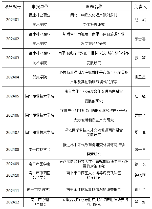 根據(jù)《關(guān)于組織開展2024年南平市科協(xié)科技智庫(決策咨詢類)課題調(diào)研的通知》(南科協(xié)〔2024〕22號(hào))精神,市科協(xié)黨組對(duì)各市級(jí)學(xué)會(huì)(協(xié)會(huì)、研究會(huì))、高??茀f(xié)申報(bào)的課題進(jìn)行了研究,擬定2024年南平市科協(xié)科技智庫(決策咨詢類)課題調(diào)研立項(xiàng)項(xiàng)目12個(gè),現(xiàn)公示如下: