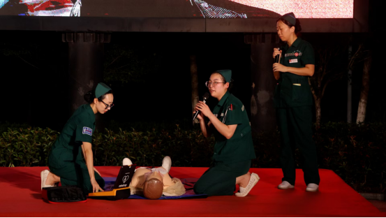 工作人員現(xiàn)場示范“海姆立克”急救技能,傳授針對急性呼吸道異物堵塞的緊急處理方法,通過特定的手法和技巧,幫助患者排出異物,恢復(fù)呼吸。