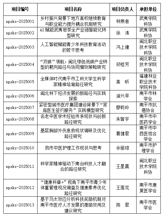 根據(jù)《關(guān)于組織開展2025年南平市科協(xié)科技智庫(kù)(決策咨詢類)課題調(diào)研的通知》(南科協(xié)〔2025〕11號(hào))精神,市科協(xié)黨組對(duì)各市級(jí)學(xué)會(huì)(協(xié)會(huì)、研究會(huì))、高??茀f(xié)申報(bào)課題進(jìn)行了研究,2025年南平市科協(xié)科技智庫(kù)(決策咨詢類)課題調(diào)研擬立項(xiàng)13個(gè),現(xiàn)公示如下: