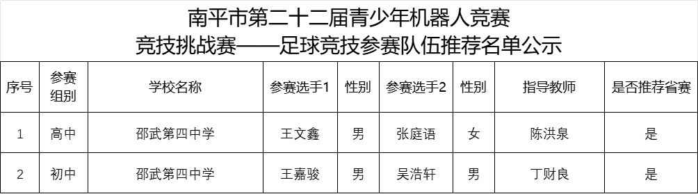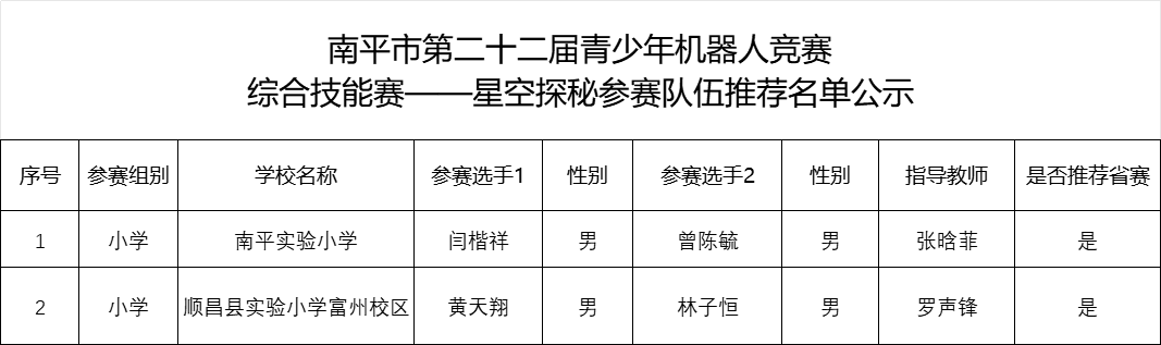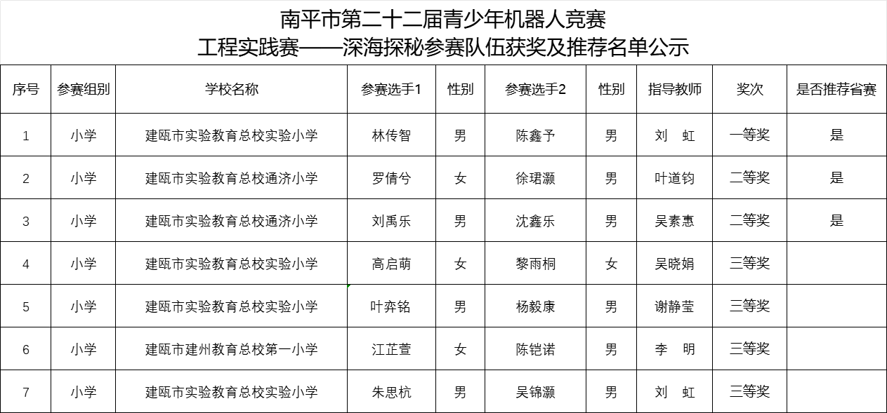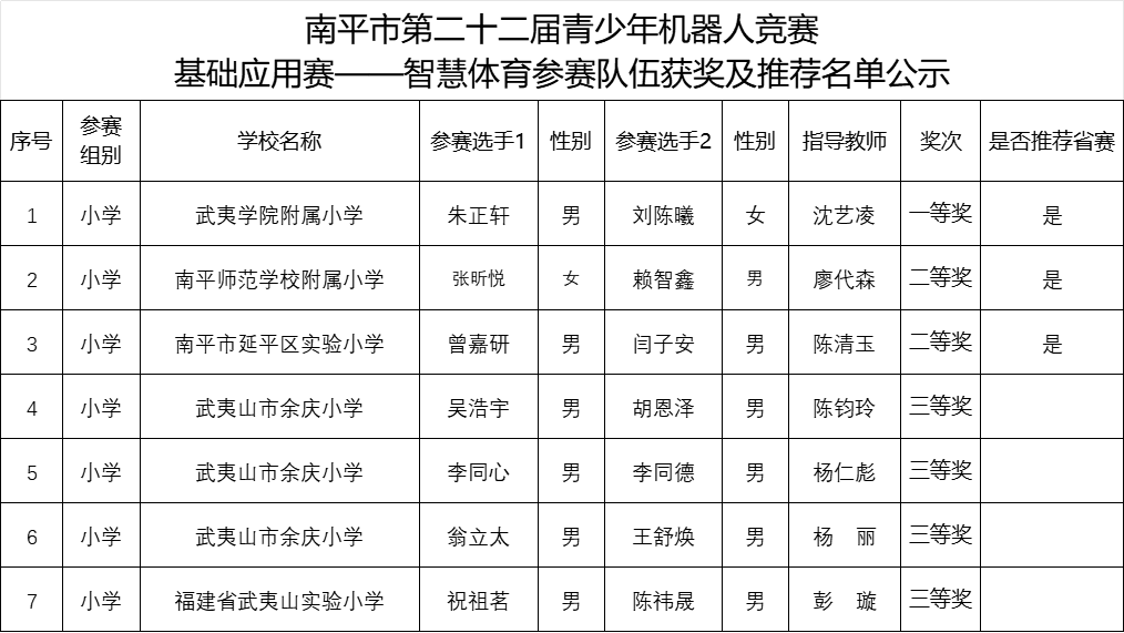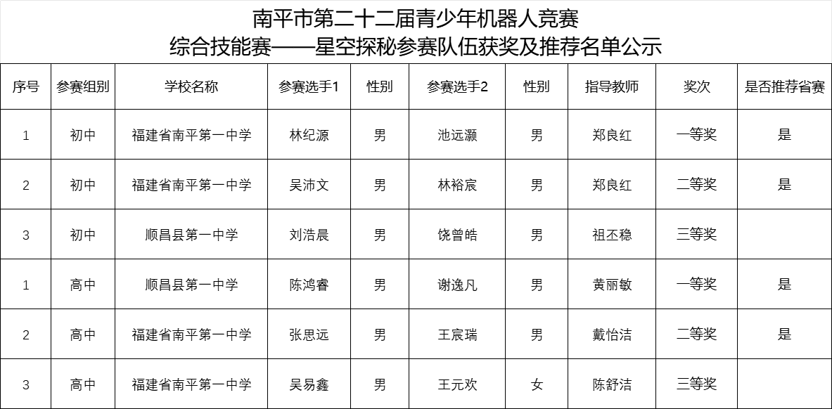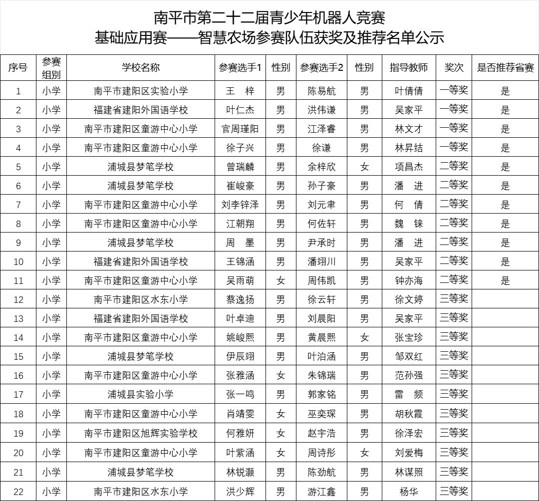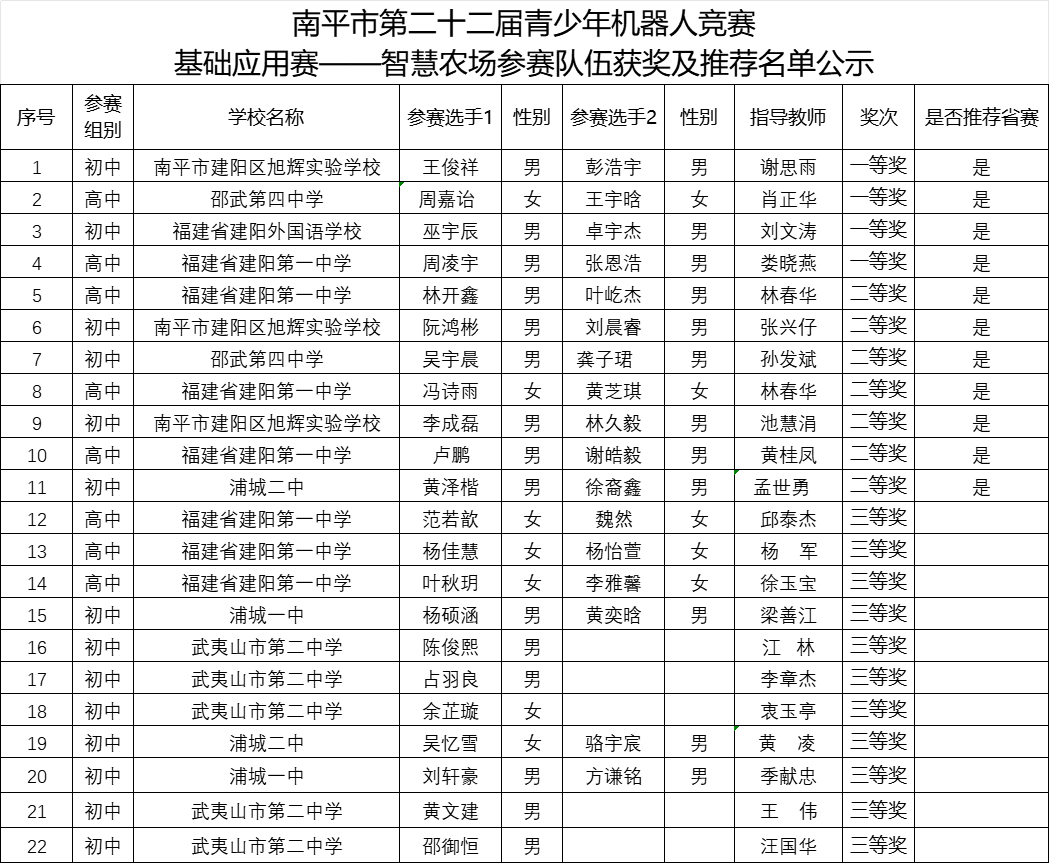 附件:南平市第二十二屆青少年機器人競賽獲獎及推薦省賽名單