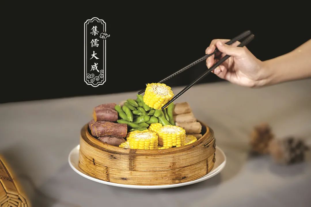 朱子總結(jié)和創(chuàng)新了諸子百家之學(xué)和先秦儒學(xué)、兩漢經(jīng)學(xué)、北宋理學(xué)等,構(gòu)建了博大精深的理學(xué)體系。朱子的學(xué)術(shù)思想,是元明清三代的官方哲學(xué)?!凹宕蟪伞边@道菜,薈萃五谷雜糧,寓朱子為中華傳統(tǒng)文化之集大成者。毛芋、山藥、紅薯、青豆等五谷粗糧色彩搭配擺盤,上屜文火蒸煮,口感質(zhì)樸清爽。