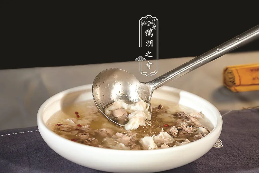 淳熙二年(1175),在信州(今江西上饒)鵝湖寺,朱子與陸九淵首開書院辯論之先河。會(huì)后歸程,朱子途經(jīng)武夷山風(fēng)水關(guān),詠《風(fēng)水關(guān)》詩(shī)曰:水流無彼此,地勢(shì)有西東。欲識(shí)分時(shí)異,須知合處同?!谤Z湖之會(huì)”這道菜取材鵝肉、葫蘆,諧音“鵝湖”,清燉鵝肉湯,輔以葫蘆和東平扁肉。寓意朱子倡導(dǎo)門派之間的辯論,有開蒙解惑,渾沌開解之效,顯兼取百家之長(zhǎng)的氣度與胸襟。