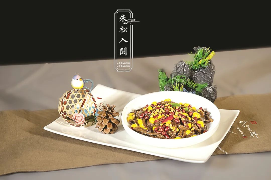 宋政和八年(1118),朱子之父朱松以同上舍出身登第,授迪功郎入閩為官,任建州政和縣尉。朱松攜父母、妻子及兩位弟弟、兩位妹妹,一家八口同赴政和。政和是朱氏入閩首站、朱子祖居地。“朱松入閩”這道菜,取材政和特產(chǎn)苦錐果、銀杏果和花生,寓意朱氏入閩后,自政和繁衍生息、苦盡甘來。炒制銀杏果、花生,以苦錐果鋪底,松塔擺盤,咸鮮可口,清爽宜人。