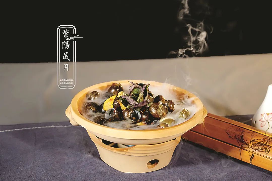 武夷山五夫紫陽(yáng)樓建于紹興十四年(1144),自14歲始,朱子常居于此樓,飽讀詩(shī)書,著述授徒,至晚年才遷居建陽(yáng)。朱子曾作《憶潭溪故居》,抒發(fā)對(duì)紫陽(yáng)樓的眷念:“憶住潭溪四十年,好峰無數(shù)列窗前”?!白详?yáng)歲月”這道菜,取材紫蘇的“紫”字,以寓“紫陽(yáng)樓”,精選殼薄、肉厚、多汁的田螺作煲,以田螺“多子多福”的民諺,寓意朱子理學(xué)在此發(fā)端,衍生發(fā)展。