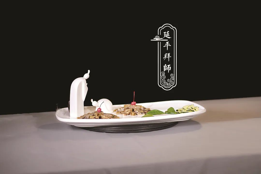 紹興二十三年(1153)五月,朱子就職同安途經(jīng)劍浦(今南平市延平區(qū))時(shí),曾拜訪父親的同門好友李侗先生。紹興二十八年(1158)正月,他從武夷山五夫里徒步300里至劍浦,攜東平小胳等,束修六禮,拜師李侗,崇師遵誨,實(shí)現(xiàn)了“棄禪歸儒”的重大轉(zhuǎn)變?!把悠桨輲煛边@道菜,取材被公布為省級(jí)非物質(zhì)文化遺產(chǎn)項(xiàng)目的政和特色小吃“東平小胳”,色澤誘人的東平小胳,輔以拜師崇禮擺件,展現(xiàn)朱子尊師敬長(zhǎng)之風(fēng)范。東平小胳是閩北百道名小吃之一,以肥膘肉、木薯粉、白糖、豆腐、蛋等為原料精制而成,肥而不膩,爽滑甘甜。東平小胳在央視熱播劇《一諾無悔》中有過精彩呈現(xiàn),并隨劇中廖俊波同志的贊譽(yù)而廣為人知。