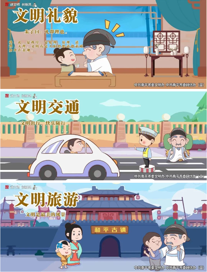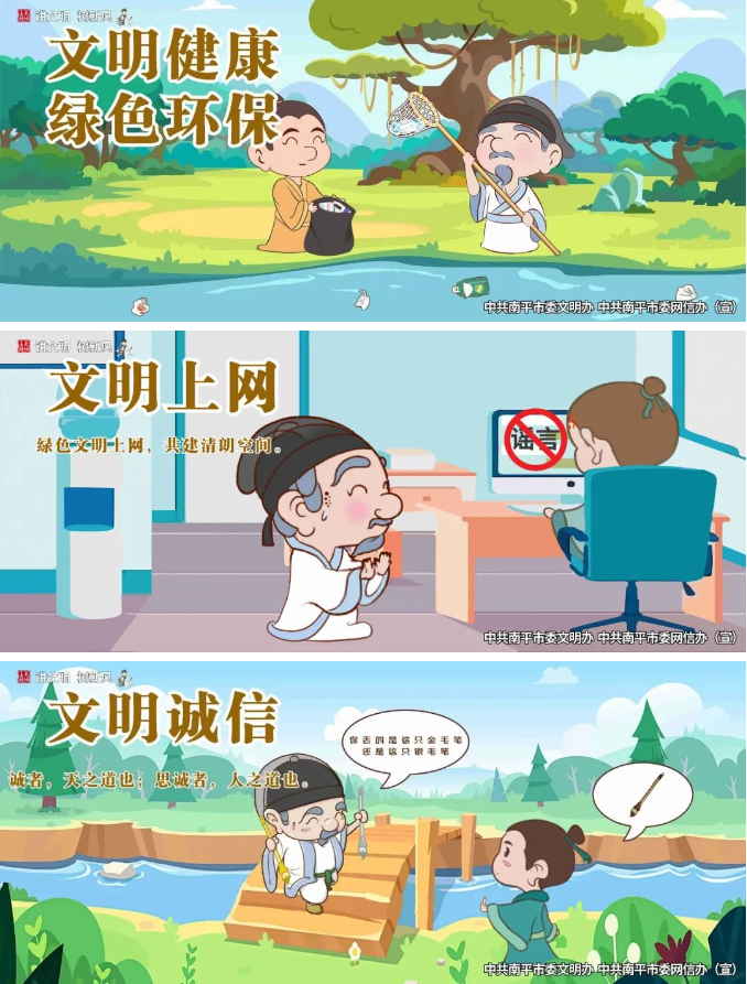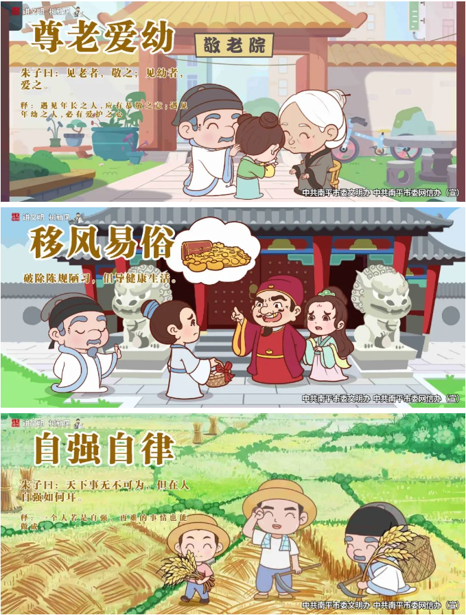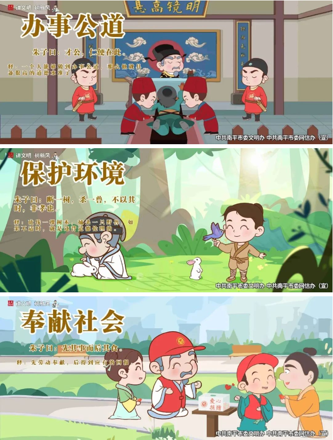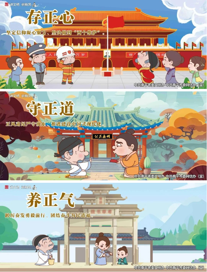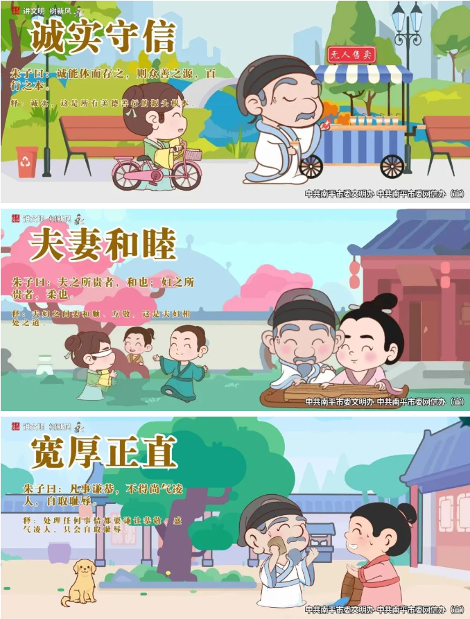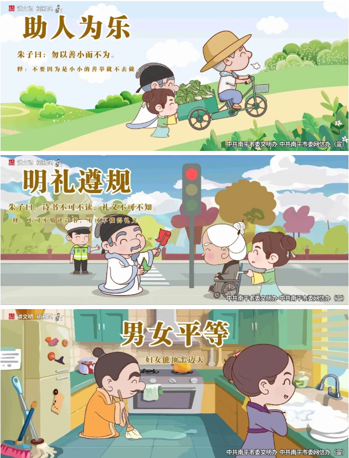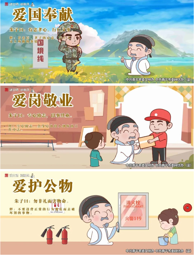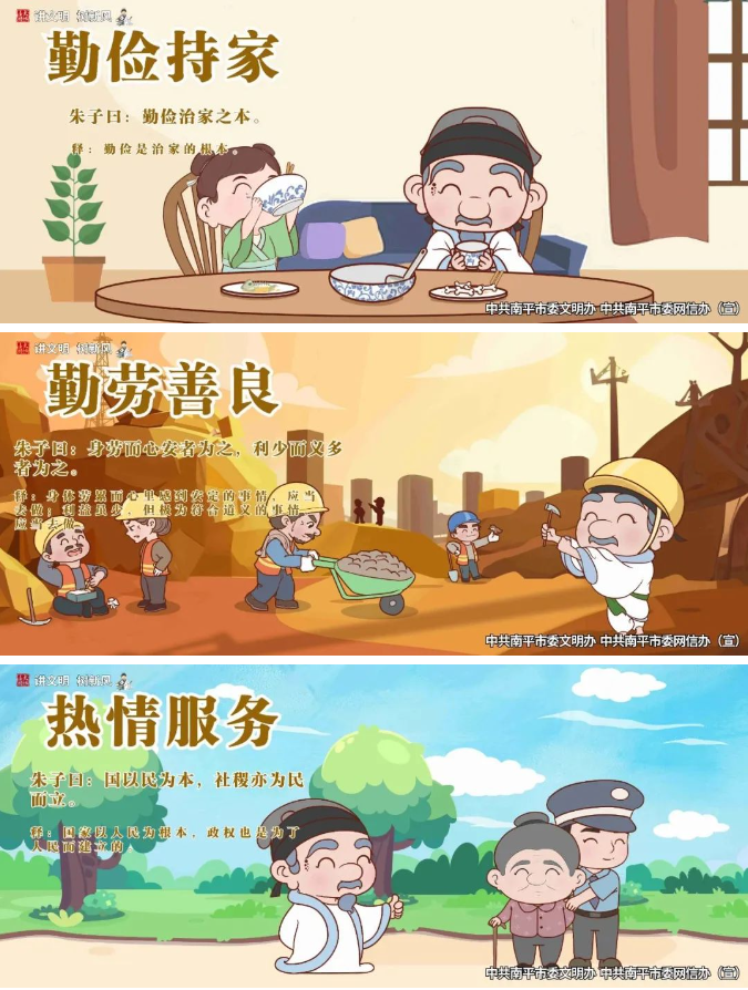 為弘揚和踐行社會主義核心價值觀,宣傳、推廣、普及朱子文化,南平市活化利用“卡通朱子”IP并開展一系列探索與實踐,推出一批將“卡通朱子”IP與“四德”“三正”相融合的卡通朱子海報。