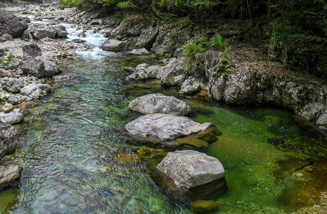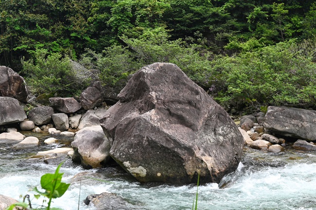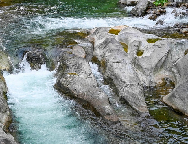 睡童子:巖石呈現(xiàn)長條狀,如童子側(cè)臥在溪中,頭部、軀干、腿部一一可辨,充滿生機(jī)和童趣。