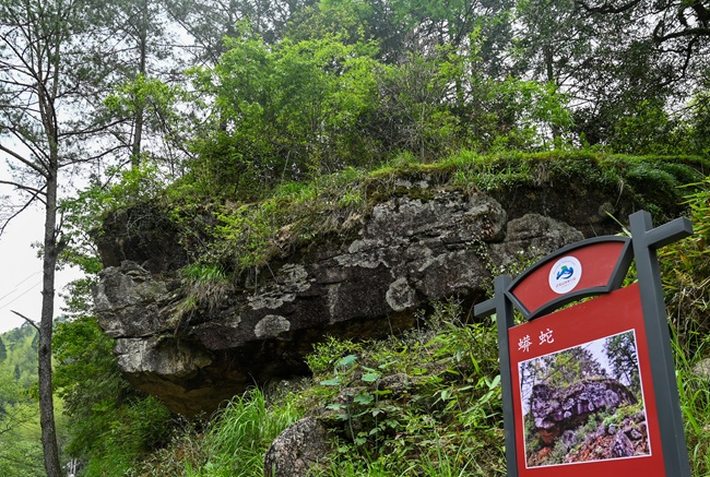 蟒蛇:仰視此塊巨石,平面斜出,宛如巨蟒之首,昂首挺立。石峰猶如蛇身蜿蜒緊傍于山間峭壁,如巨蟒出洞之姿,俯視整片綠林山野。