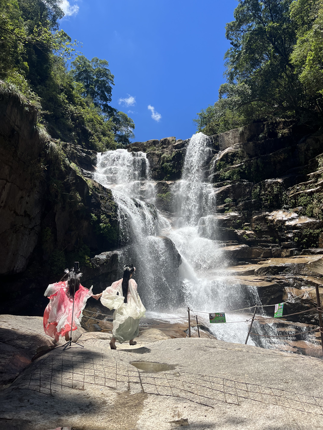 “不僅是青龍瀑布,月亮灣這個(gè)景點(diǎn)也很出片,隨手一拍皆是風(fēng)景?!币曨l博主“小吳小吳”吳秋雪和“桔梗兔”張燕瓊十分驚喜,她們身穿古裝,在青龍瀑布和月亮灣拍攝了多組視頻、照片,對(duì)此次的取景拍攝十分滿意。