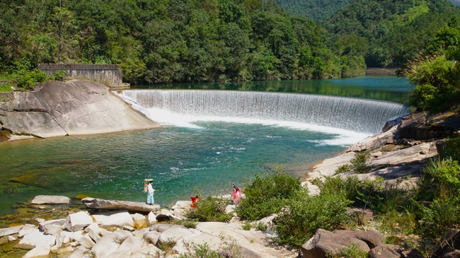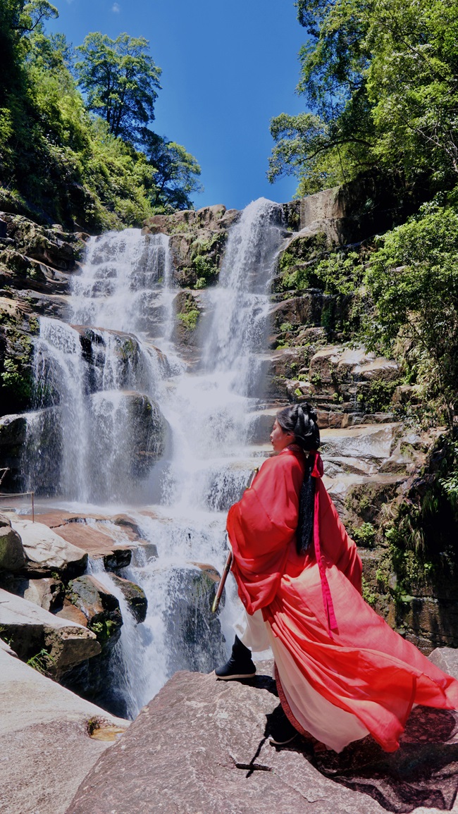 游客身穿古裝在青龍瀑布拍照取景 (林李冰 攝)