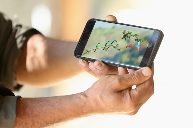 8月12日,福建南平市延平區(qū)爐下鎮(zhèn)斜溪村村民王崇年展示手機里攝影愛好者發(fā)來的藍(lán)喉蜂虎照片。 (新華社記者 姜克紅 攝)