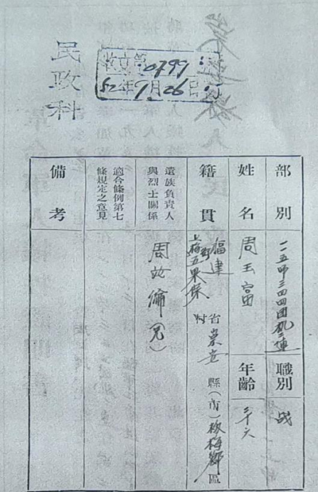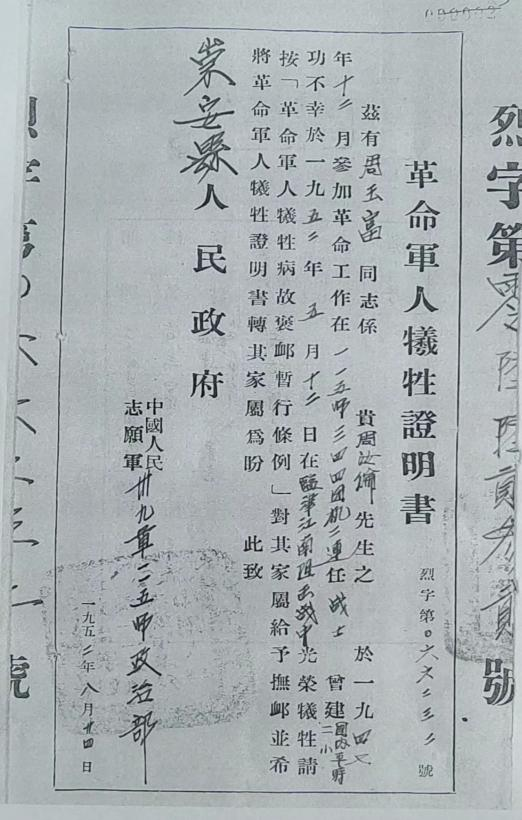 2.烈士周玉富,男,福建省崇安縣板梅鄉(xiāng)上梅街五果保人(按當(dāng)時記載的文字編寫),1947年12月參加革命,原中國人民志愿軍三十九軍一一五師三四四團(tuán)機二連戰(zhàn)士,榮立國內(nèi)平時二小功,1952年5月12日在臨津江南阻擊戰(zhàn)中光榮犧牲(烈士哥哥周汝倫)。